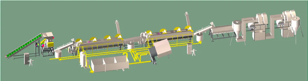 柯達機械制造各類型再生塑料全套破碎清洗分離生產(chǎn)線,與Toplun(菲律賓)、KSI(馬來西亞)、泉源塑膠(印尼)、新華泰(泰國)、海鹽海利等PET再生利用大型生產(chǎn)廠家合作,大部分客戶清洗的PET切片均對接Adidas,Nike等世界知名企業(yè),柯達機械PET工藝略異于市場生產(chǎn)線,多出市場上的冷熱預洗及堿洗后增加酸性中和清洗,在整個工藝中務求減少PET切片的刮痕損傷,降低粉末損耗率,快速酸性中和保固PET成品料粘度。每個工序點都為生產(chǎn)出高粘度,低損耗PET成品而設計。